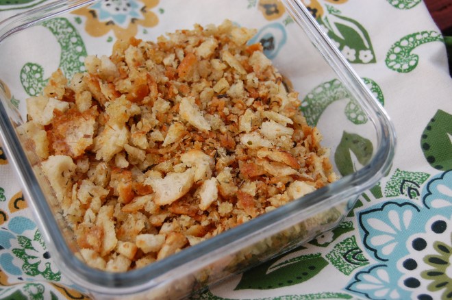 I know what you’re thinking. Why on Earth would I bother making homemade bread crumbs when I could just buy them at the store? Well, take it from me, these are better. (Even better than Jaclyn’s brand bread crumbs, which they sell at Whole Foods and which I of course own.) They are crispy and chewy, olive oil and oregano-kissed. Your second question might be, what would I use them for? The answer: anything and everything. They are great over casseroles, but I’ve also sprinkled them over soups and salads instead of croutons and even tossed a handful over hubby’s dinner when he was being finicky. Worked like a charm.