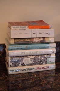 …Just a little bit.  Sometimes I don’t know when to stop.  It’s a particular character flaw of mine: I get carried away in libraries.  I don’t think there’s a cure.  It happens in tea shops too, but usually not to this extent.  (That involves spending money, which tempers me a little bit.  Darn free public library.)  The seeds for this particular binge were sown a few weeks ago.  I had two books on the Holds shelf at the library, which is a blessing and a curse at the same time.  On the one hand, I’m excited to read the books I get from the Holds shelf.  That’s why I put them on hold.  But I can’t just go in there and get a couple of books and then leave.  I have to make a loop through the stacks.  So I did.  Mistake 1.  Then, while I was wandering the stacks, I whipped out my Blackberry and checked my Goodreads app to see if there was anything calling my name from my to-read list.  Why yes, there was.  Mistake 2.  45 minutes later, I was struggling through the back door of the house, juggling a stack of five books – including two chunksters – while hubby stared at me in abject horror.