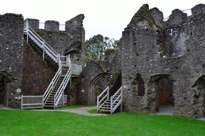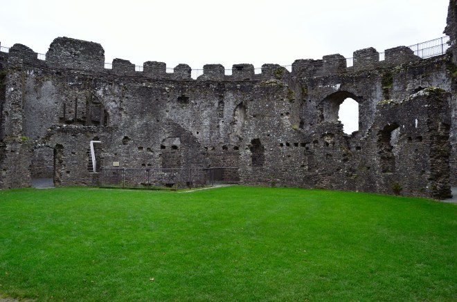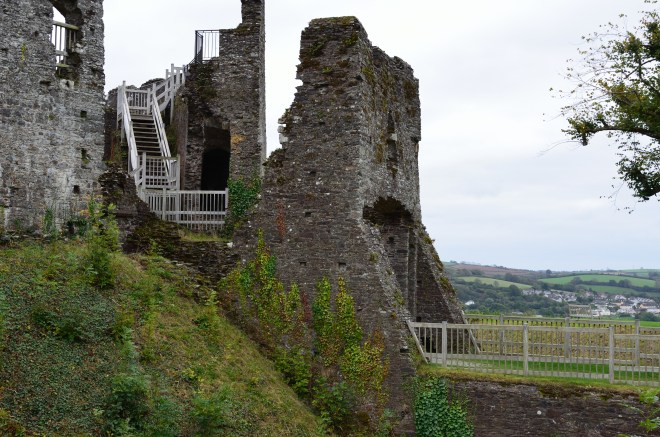 The castle ruins included a large green in the middle, and were perfectly safe to wander about and climb on (using the stairs, of course). And to add to the experience, each “room” in the castle included an informative placard explaining what the room was used for when this was a working castle. We saw the kitchen, the chapel, the lord’s bedroom, and others. Hubby and I finished off the visit with a walk around the upper ring of the ruins… well, almost a run for him – he doesn’t much like heights – and a stroll for me, since I lurve heights. (Really, I do. I have a thing for views from high places and I could spend hours gazing from an observation post. The higher the elevation, the better.)