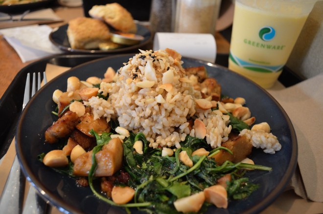 (Pictured: my lunch at Teaism, my old standby – seitan stir-fry, which is freaking delicious, and a mango lassi.  Unpictured: everybody else’s lunches at Teaism, which they said were delish – my mom had chicken curry, our friend had a salmon bento box, and darned if I can’t remember what my aunt had, but I know she loved it – our appetizer spread for dinner that night, our lunch at the American Indian Museum on Sunday, and our dinner of tilapia with brown-butter citrus sauce, roasted fennel and herbed orzo.  We were too busy eating to snap many pictures, sorry ’bout that.  It was all so stinking good.)