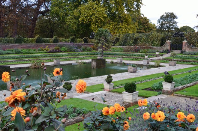 After fortifying ourselves with tea, sandwiches and scones (and, okay, the pastries too, although they’re always my least favorite part – give me crustless cucumber and smoked salmon sandwiches, and scones with clotted cream and jam any day), we meandered over to the Sunken Garden, another London must-visit for me.  I love to gaze wistfully in – it’s roped off – and dream of how, if I was Duchess Kate, one way I’d exercise my royal prerogatives would be to talk my way into an afternoon of lounging inside the garden with a book and a pot of tea.