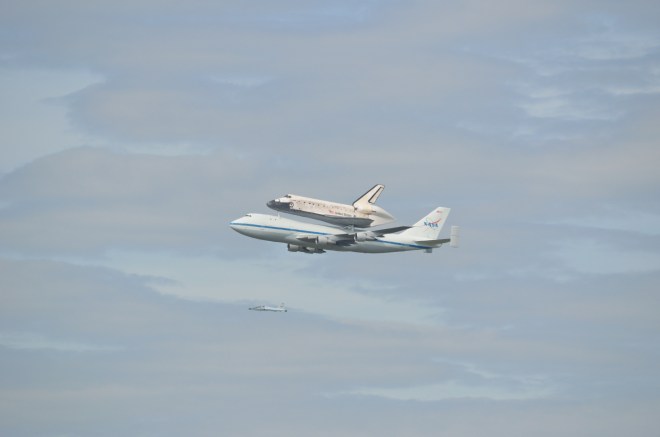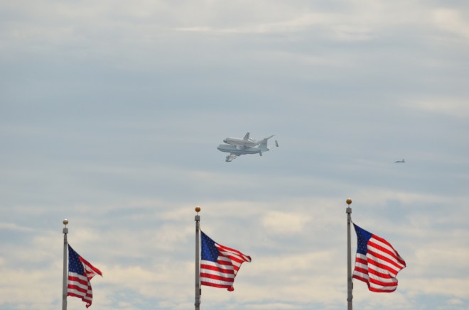 Discovery approaches the Mall, escorted by a couple of fighter jets. They were about 5 minutes early, so many people missed the initial approach. Lucky hubby just happened to be looking in the right direction.