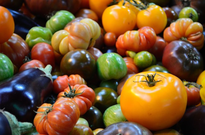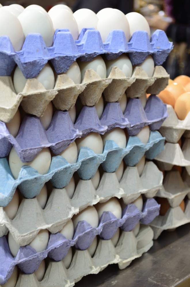 Look at those piles of fruits. How I wished I could have tried them all. And the vegetables – oh, my gracious Heavens. Piles of ripe heirloom tomatoes – in October! – each one unique in its shape and shade. Stacks of squash, carrots, peas… I imagined the fresh vegetable stew I could create. And the cauliflower – I love cauliflower, and Turnips arranged purple, green and orange heads together in an autumnal explosion of color. And then if the fruit and veg displays weren’t enough, I found stacks of creamy eggs in soft-colored cartons that looked like a painting.