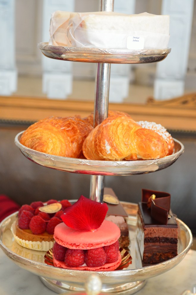 In addition to the macarons (I went with my four go-to flavors, by the way: black currant, salted caramel, raspberry and coffee) we enjoyed a “traditional” afternoon tea with a French twist.  Tea sandwiches on the top tier, then an assortment of croissants, and finishing with the pastries.  Now, I know I told you I can take or leave pastries, and that’s generally true.  Consider Laduree the exception that proves the rule… because WOW.  They were all incredible, but the best was the gigantic raspberry macaron “tart” that’s flaunting its gorgeousness right in front there.  Hubby and I split each of the pastries, and I strongly considered hitting him with my purse and stealing his half of that baby.  (I didn’t, because I love him.  But next time we go there, I’m getting one all to myself.)  In retrospect, I’m glad we didn’t get into the Georgian Restaurant, because the Laduree tea was the most decadent I’ve ever had.  If you’re visiting London and have time for another tea, don’t hesitate to get this one.  I was a little unsure at first – it seemed wrong to have croissants instead of scones at Harrods, of all places – but the macaron tart was to. die. for.  (And if you don’t have time for tea, at least stop and pick up some macarons.  And get a black currant one for me.  Thanks.)