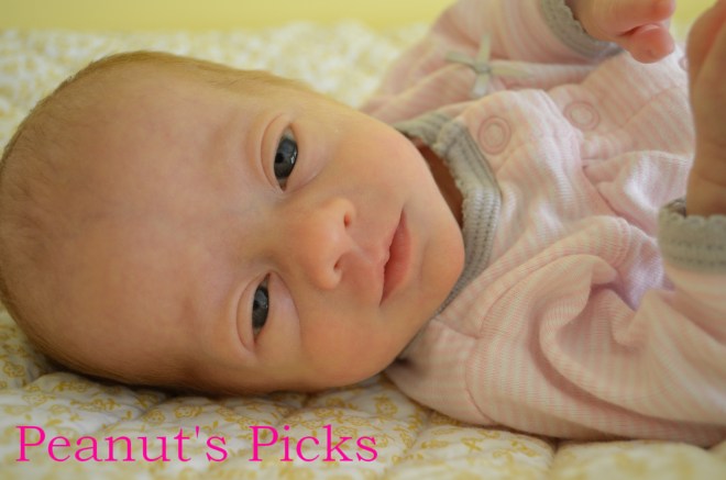 Hiya, bloggies! Peanut here! Life at home is great. I have Mommy and Daddy completely wrapped around my little finger – it didn’t take long. Basically, I get whatever I want. All I have to say is “Nyaaaaaaaaahhhhhhh!” and they come running to feed me and change me from one cute outfit into another and rock me until I fall back asleep. It’s a good system we have going on, if I do say so myself. One of my favorite things is when Mommy and I sit together in the rocking chair in my room and Mommy reads to me. We look at all kinds of books together – books with lots of pictures, books with cardboard pages, and even some big kid books with lots and lots and LOTS of words. Mommy said I could use her blog to tell you about some of my favorite books, since I’m such a big girl now. (Please note: I can neither confirm nor deny the rumors that this post was ghostwritten by Mommy.)
