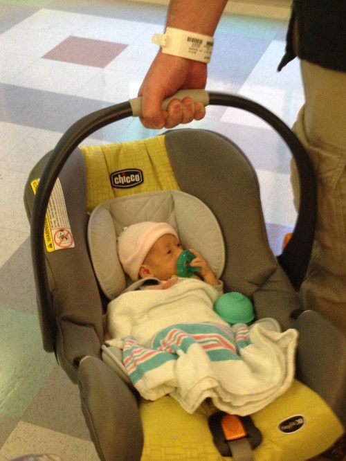 The best day of Peanut’s second month was October 11, 2012 – Homecoming Day! We had some indication a few days prior that discharge was in the offing, so we were prepared with a stocked nursery and a packed diaper bag. Still, it was a shock how quickly the discharge happened, once the day dawned. From the doctor’s final once-over to signing the discharge papers and walking out of the hospital, it was about 90 minutes. Even with all the congratulations and goodbye waves and we’ll-miss-yous and come-back-for-NICU-reunions, hubby and I still felt like we were getting away with something when we carried Peanut out the doors! And it was eerily quiet once we got her home – we weren’t used to hanging with Peanut without the sound of monitors beeping. But we settled in quickly and we like this new, wireless home model baby even better than the fully wired hospital model.