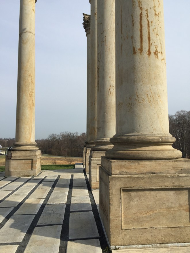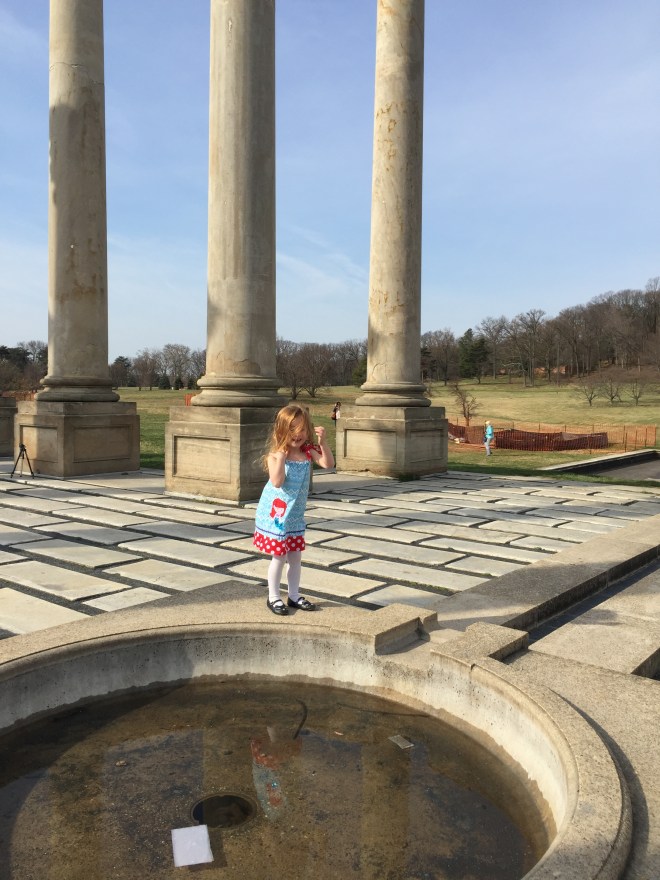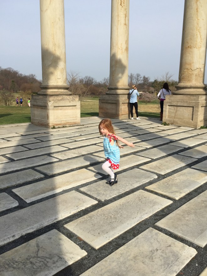 And all the while, the little dude was whining and complaining in my ear, kicking me and pulling my hair.  He thought it a spectacular injustice that his sister was running around treating the columns as her own personal Broadway stage, while he was still trapped in a backpack.