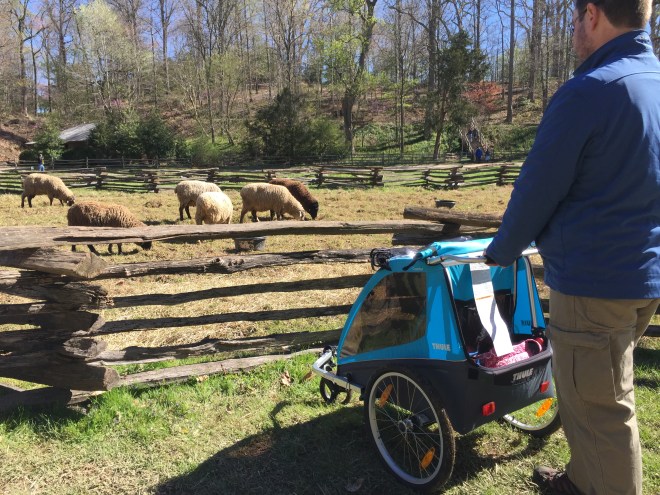 Eventually we had our fill of the (grown-up) sheep down at the Heritage Farm and headed back up the hill, stopping about halfway up to let the kids out of the stroller – they’d had enough riding.