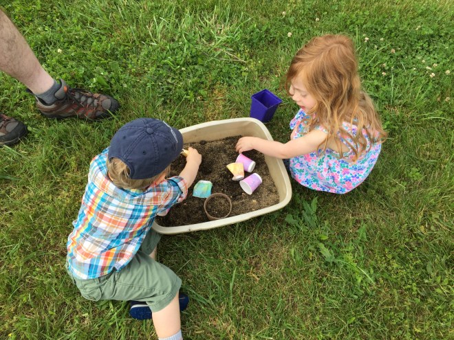 He dug in the potting mix while Steve helped Peanut fill up her little purple pot, and then April ended up planting a bean for him.