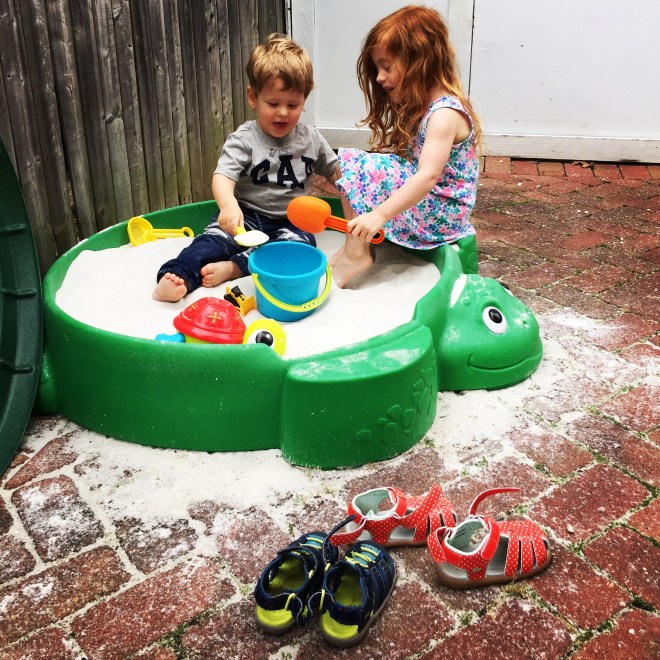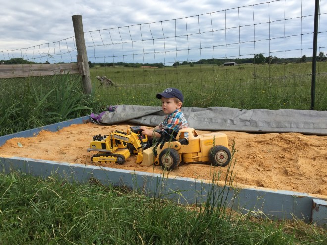 April even kindly added a trip to see the “tractor” (it was a lawn mower, I think?) on to the program, since Nugget talked about tractors the entire time. He liked the tractor. He liked the sand box even more, with its fleet of trucks.