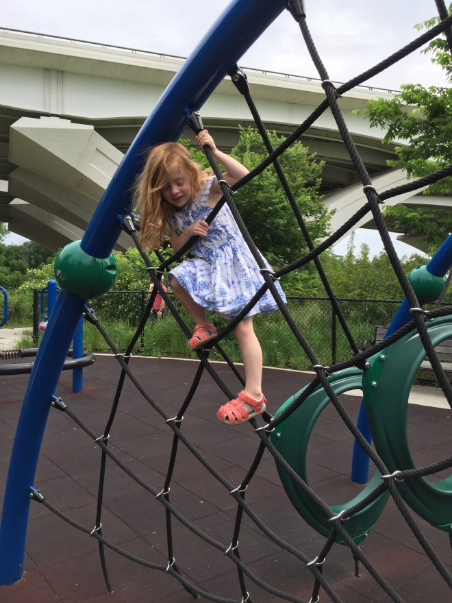 Although the overpass area was cool (and would be a great – safe – place to teach a kid to ride a bike, as several families were doing) we didn’t linger there. Instead, we checked out the map and made our way to our first destination – the playground. (Yep, second playground of the day.)