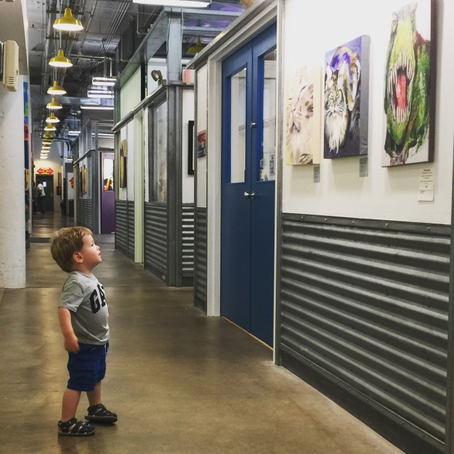Zan and Paul left to go to a cookout with other friends just as our kids were waking up, so we headed out for more fun, since the weather was so gorgeous. We tried the playground again, but there was a toy-snatching incident (Nugget’s favorite school bus was grabbed by another kid and I had to chase the kid all over the playground to get it back – his adult didn’t lift a finger to solve the problem, which annoyed me) so I took Nugget home early. We met up with Dad and Peanut and headed down to the waterfront for some art appreciation (dinosaur and kitty paintings!) and dinner.