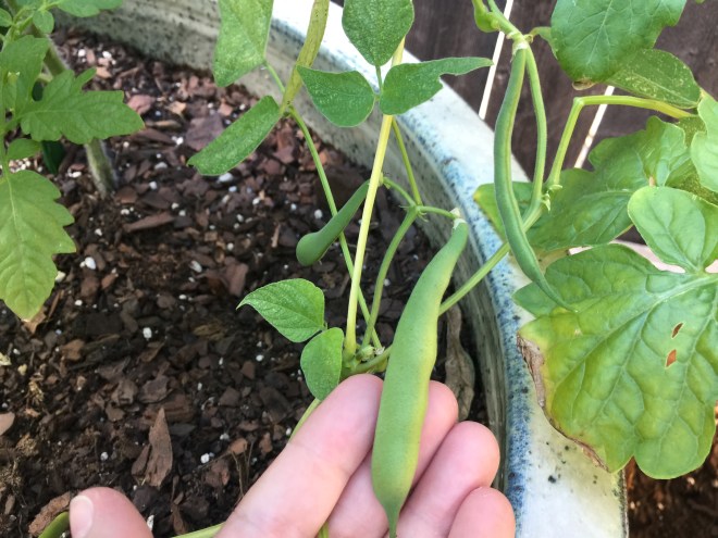 We also had a few green beans that were big enough to harvest from our bean plant.  This was a very pleasant surprise – Peanut came home from school with the bean plant one day this spring; I believe it was the result of a unit on seeds.  I planted it, because why not?