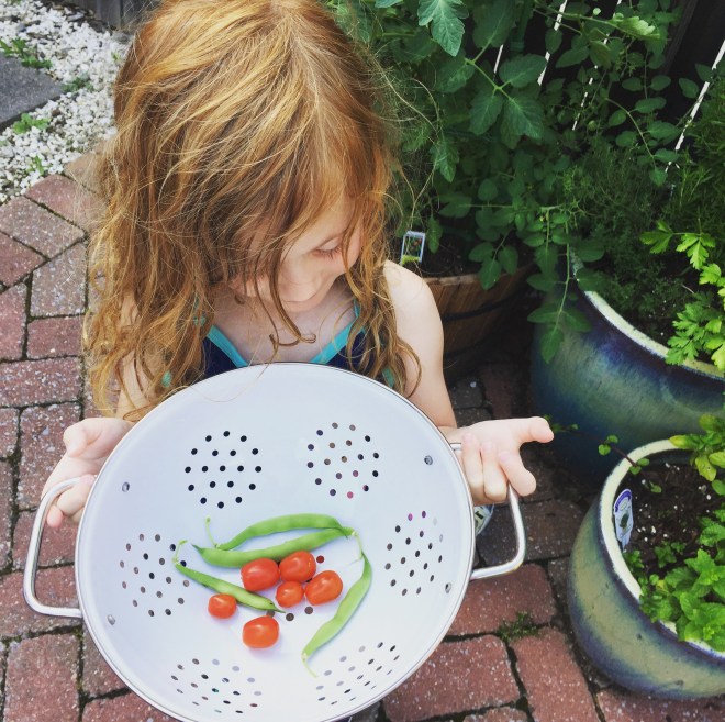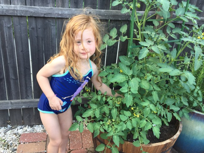 Happy harvester!  We successfully picked six little cherry tomatoes (which we ate for dinner – Peanut even tried one and said she liked it, so SUCCESS) and four green beans (which no one but Mom will touch).  And all while dodging Nugget-planted obstacles like extra watering cans strewn about with a partially-deflated “soccers” ball to keep things interesting.
