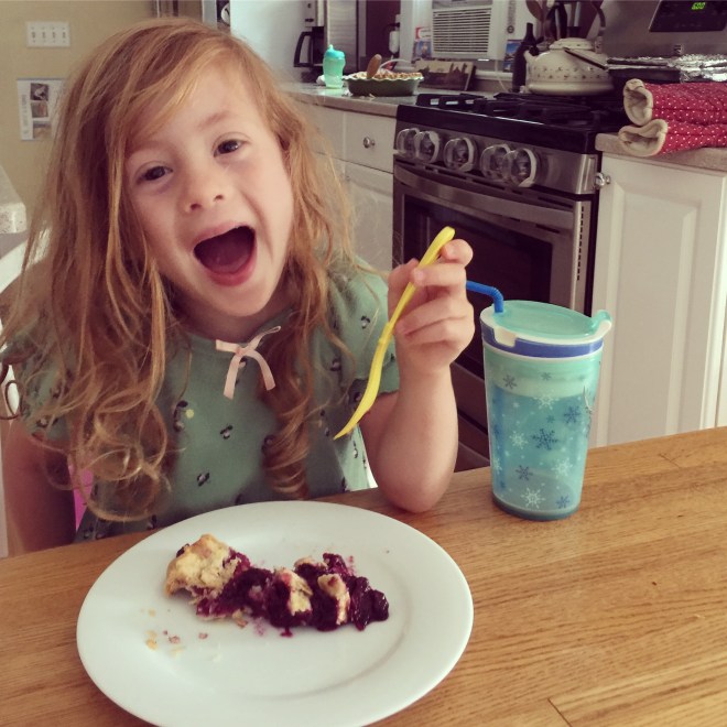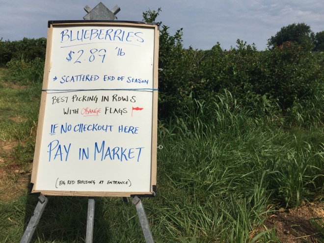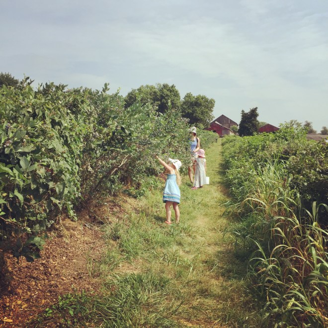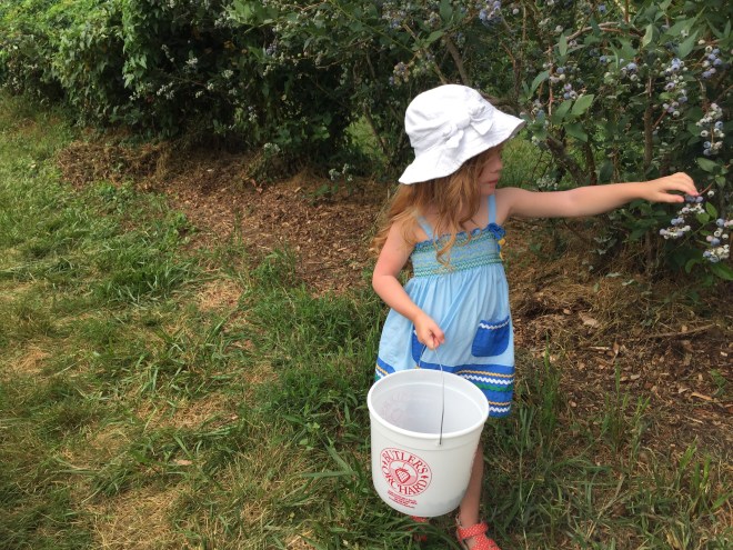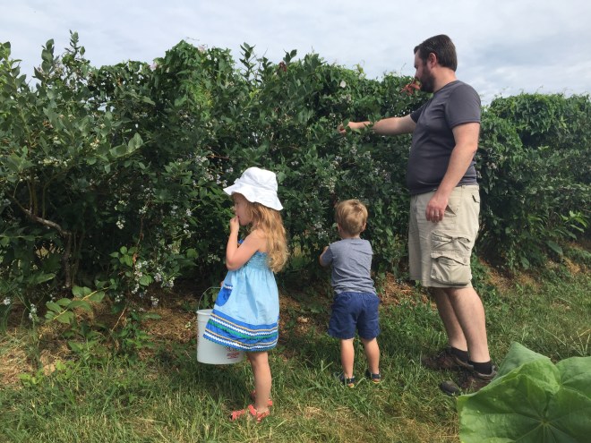 There are so many picking options in the summer – it’s hard to know where to start!  Pick-your-own flowers are a thing here, and there’s a place to pick any kind of fruit or vegetable that interests you.  We missed strawberry season again (every year) but blueberries were still an option, so I declared last Saturday blueberry picking day.  I love picking blueberries with the kiddos – they’re not ready for the blackberry and raspberry brambles, but blueberries are a perfect choice.  No thorns, growing in thick clusters on high bushes – it’s as if someone designed blueberries to be harvested by toddlers.