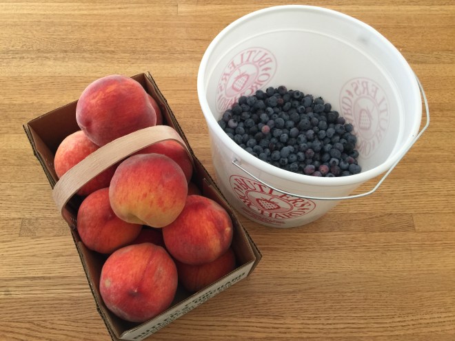 Blueberries all freshly picked by Peanut and me!  (The peaches were from the farmstand.  And unpictured – I obviously also bought the kids books: a berry counting book for Nugget and a garden science book for Peanut.)