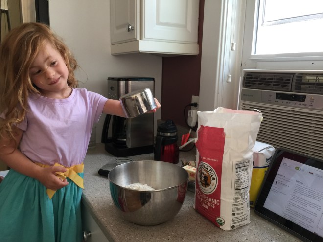 She was so excited to be baking like a big kid.  I had to drive the ship, of course, but she surprised me by doing a great job following my directions.  Now I want to make baking with her a regular activity!