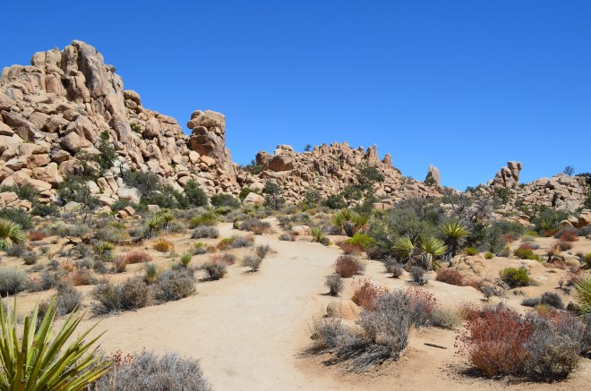 At this point, Steve suggested we “make it an out and back.”  I was reluctant to turn back and see the same scenery over that we had already been through.  We asked a couple of hikers who were doing the loop trail in reverse how it was in the direction from which they’d come, and they assured us that once we got down out of the narrow path, it would be smooth sailing.  We took their word for it, descended some rock stairs, and found that they’d told the truth – the rest of the trail was flat, easy, and completely different from the rock formations we’d been seeing.  Now, we were completely surrounded by the park’s namesake Joshua trees!