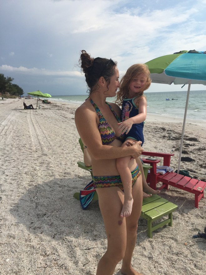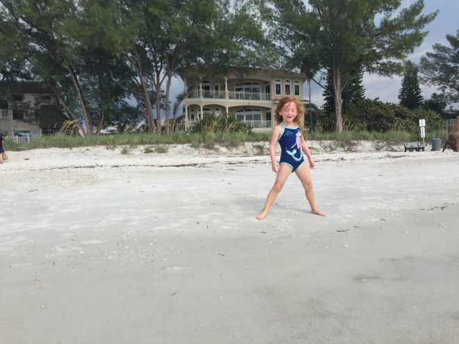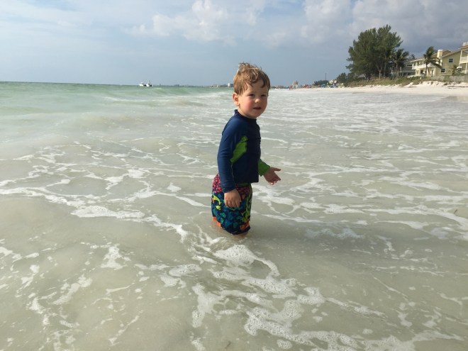 We arrived in Florida a day late and a hundred dollars short. No, seriously, we did. Poor little Peanut started showing signs of being sick at 6:00 p.m. on Wednesday night. Our flight to Tampa was scheduled to leave at 9:00 a.m. on Thursday, but there was no question – she really needed to go to the doctor (which opens at 8:30 a.m.). Southwest allowed us to change our flight to Friday morning instead (for the low, low price of $100). And sure enough – double ear infection. Ouch. Poor kid! She left the doctor’s office with a prescription for antibiotics and permission to fly the next day. So, off we went to Florida on Friday instead of Thursday. Once we got there, we didn’t waste a second – off to the beach! Peanut was thrilled to see Aunt Rebecca.
