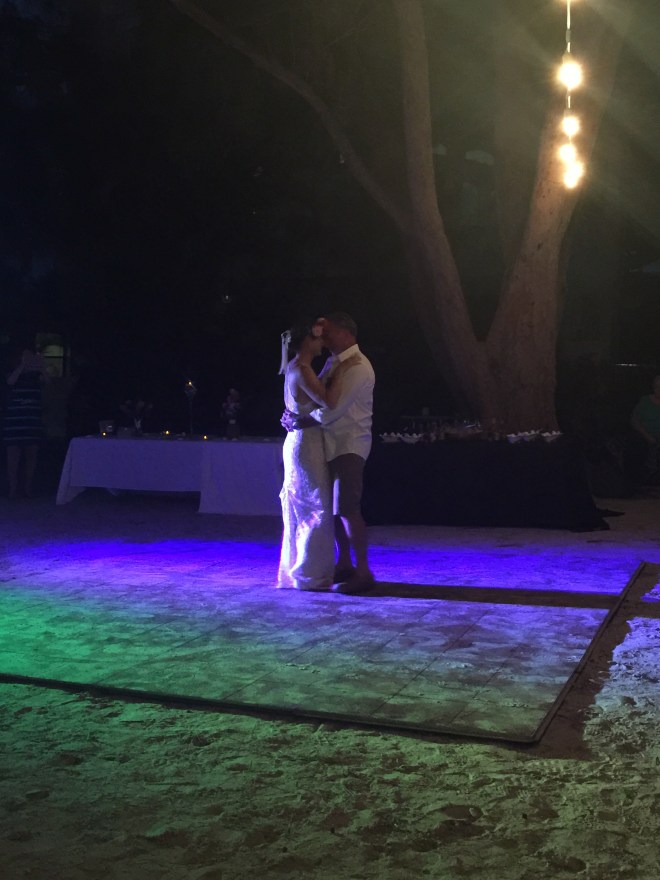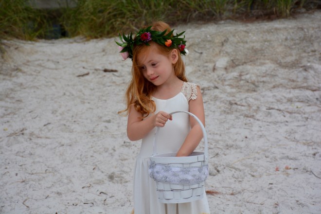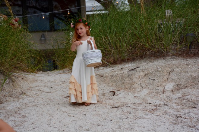 Peanut and I headed over early to get ready with the west of the wedding party, and before we knew it, we were walking down the sandy “aisle.” Peanut was radiant! At five years old, she has long been crazy for weddings – Rebecca’s was actually the fourth one she’s attended – but this was the first time she actually got to participate. She took her flower throwing extremely seriously.