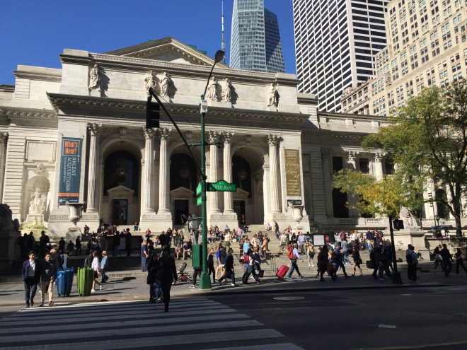 Last week, Steve and I snuck away for a long-planned mini-break. As I told y’all on Monday, almost a year ago, I bought tickets to see Hamilton on Broadway. The only tickets I was able to get were for a Thursday night, so we took a long weekend, flew my mom down to D.C. to watch the kids, and hopped on a train up to New York. We arrived in the city mid-day Thursday, checked into our hotel (more about that in a minute) and headed out to wander the neighborhood for a bit. First stop – only a block away – was the New York Public Library!