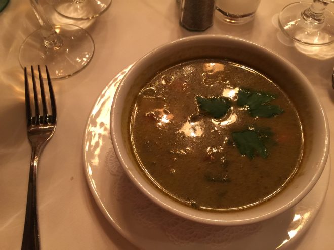 Appetizer course: salmon tartare for him; soupe au pistou (Provencal vegetable soup) for her: