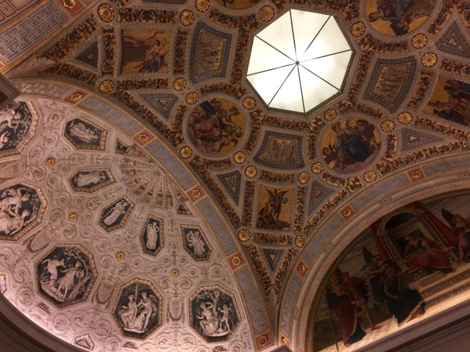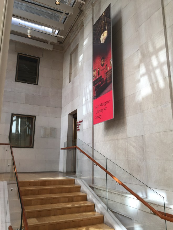 After we’d gotten our fill of the treasure bindings, we made it to the section I was most excited to see – J.P. Morgan’s personal library and study! Steve asked me what made the Morgan library interesting/worth seeing. So I explained that Morgan was one of the financial titans who lived and enjoyed his fortune in a time when collecting rare books and artifacts was a big status symbol. However, unlike D.C.’s beloved Henry Folger (who focused completely on Shakespeare’s First Folios and rare Shakespeareana and eventually created our Folger Shakespeare Library), Morgan didn’t have any one author or artist who interested him in particular. He just bought whatever seemed super-cool. And, as I learned from Book Riot, his librarian – Greene – was extremely cool in her own right (go listen to the episode, if you haven’t already heard it!). Enough rambling – let’s go inside.