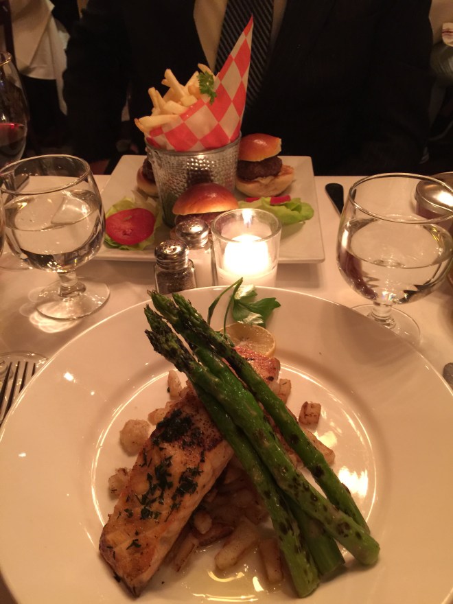 Entrée course: kobe burgers for him; salmon with potatoes and asparagus for her.