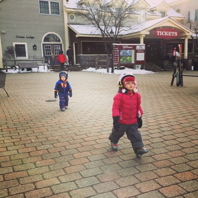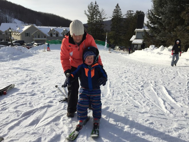 Our first (and, as it turned out, only) stop was the bunny slope, Jiminy Cricket.  We let the kids watch for a few minutes so they could see other littles their ages on skis and get over some of the fear, and then they took short runs between my dad’s legs and clinging to a ski pole.  This is exactly how I learned, so it was pretty cool to watch.  Full circle.