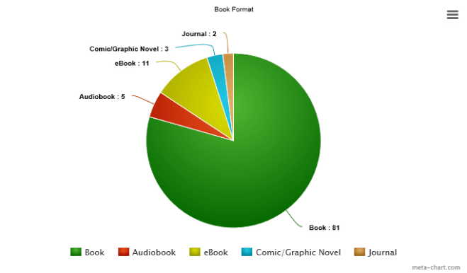 Unsurprisingly, I was heavily into physical books this year – always am. I don’t have a particular prejudice in favor of physical books; they just tend to be what I pick up. And when you consider that the comics/graphic novels (only three this year, which is a departure from the past couple of years) and journals that I read this year are also physical objects, that’s even more. I did read more electronically this year – five audiobooks and eleven ebooks – than I have done in the past, which is interesting. (Despite what this chart may look like, I don’t place a value on reading physical books or reading electronically, so I have no 2018 goals in either direction. I gravitate more toward physical books because I can’t read on my phone, as many ebook readers do – too much time looking at my phone screen gives me debilitating headaches. My kindle doesn’t have the same effect, so most ebooks I’m reading are completed with that device.) The one thing that I really like is that it appears I read across a number of different formats – including two journals – this year. I’d like to keep that up, and to read more journals and more comics, in 2018.