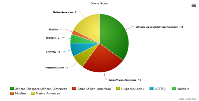 In 2017, I set the goal to read at least 33% diverse voices (which I sketchily defined as including racial minorities, the LGBTQ+ community, and underrepresented religions, or a combination thereof). That goal doesn’t quite get me to 33% people of color (which is the American population, roughly) because some of the categories – like LGBTQ+ and underrepresented religions – can and do include white writers. But I like the number 33% because I think it’s a serious goal. (Note: I didn’t actually set a number or percentage goal for 2018, but I am still paying attention and actively seeking out diverse books.) Anyway, the chart above shows how I did – and it’s good. For the second year in a row, I exceeded 33% of my booklist being devoted to diverse books. At 40 books out of a total of 102, I came in at about 39.6%, and I am really pleased with that. Some of the best books I read this year were by diverse writers and writers of color – like Little Fires Everywhere, by Celeste Ng, and The Hate U Give, by Angie Thomas – and I don’t know that they would have come my way if I hadn’t been actively seeking them out. That effort is the thing, and it’s so important. I don’t say that to congratulate myself – goodness knows I have room to improve – but to point out that it’s easy to fall into a pattern of not seeking out diverse books. This is a problem in publishing. It shouldn’t require planning and legwork and commitment by the reader to track down and obtain these books; they are compelling stories told in great prose and they deserve a lot more exposure.