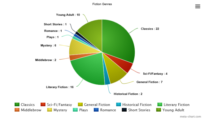 Haha, I have way too much fun with the pie charts! They’re pretty much indefensibly geeky, but I say LEAN IN. I don’t think anyone feels like they read enough of the classics, right?! My perpetual struggle is to balance my goal/inclination to read more classics with my goal to read more books by people of color. Way too few of the “classics” in the canon are by people of color, and it’s not because people of color don’t write gorgeously or have compelling stories to tell. Ugh, embedded racism. This year I’m going to try to hit both goals by reading Morrison, Baldwin and Wright.