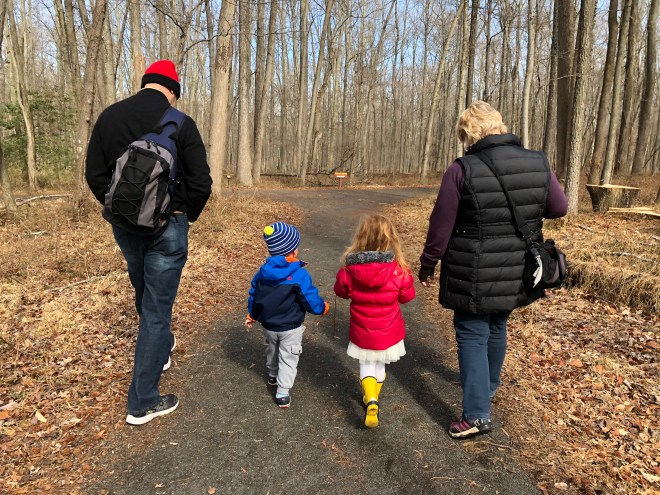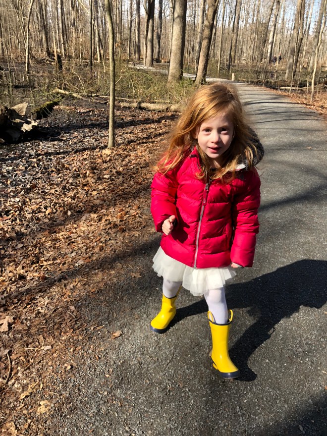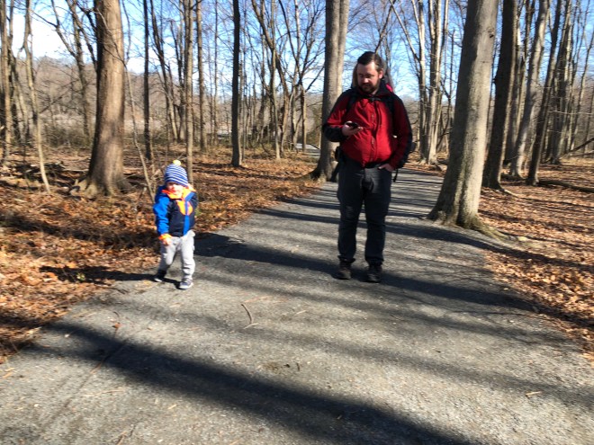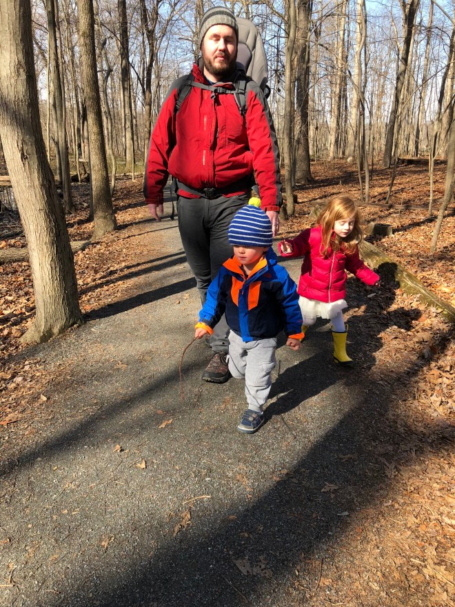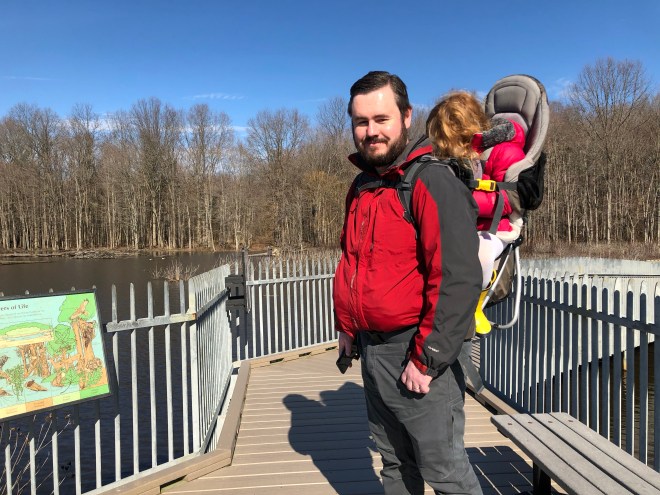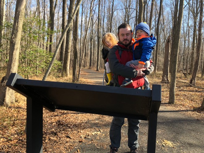 The hike started with a nice, flat trail through the woods, and everyone’s favorite – explanatory placards about the wildlife in the park. It’s mostly wetlands, which makes sense, because D.C. and northern Virginia is a swamp. Peanut started the hike in the backpack, but Nugget wanted to walk.