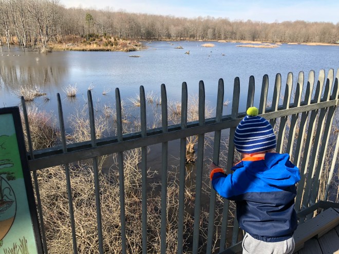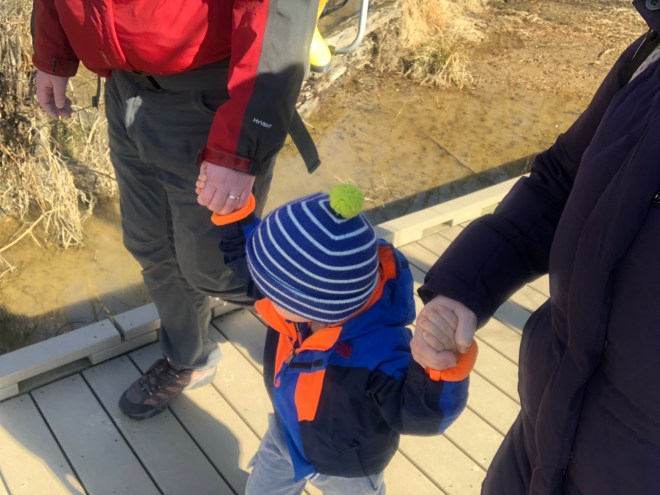 We were a little anxious about letting Nugget walk the boardwalks, but he was wonderful – held tight to our hands and never tried to run off. I carried him through certain sections that the geese seemed to like for their toilets – gross. We were literally picking our path through mounds of goose droppings, and it was actually really smelly. Yuck. But only in sections. I don’t know…