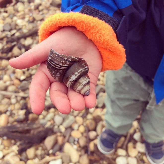 Nugget wanted to explore down by the river, so he and I walked down together.  He had about ten minutes of pure glee, throwing rocks into the water (what is it with little boys and throwing rocks into water?) and I was delighted to find a huge stash of perfect spiral shells.  On the banks of the Potomac.  Who knew?