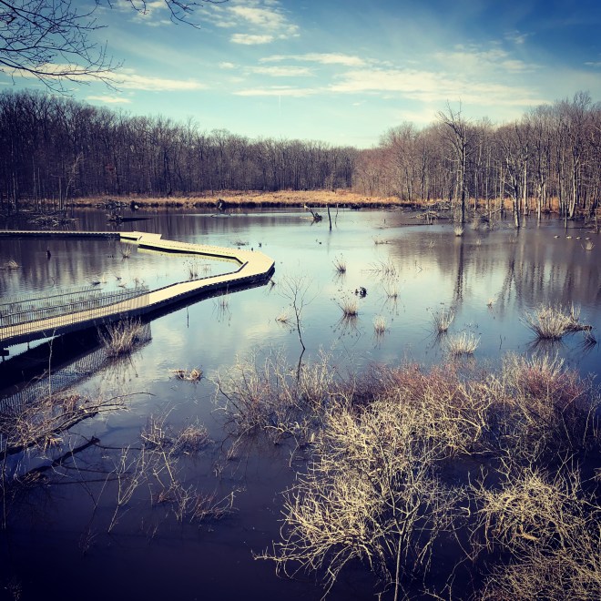 Hike 3: Huntley Meadows Park (Alexandria, VA), February 17, 2018. Almost a month off between hikes – ouch; not a great start to this challenge. Felt good to get back on the trail, even if the boardwalk was lousy with goose droppings.