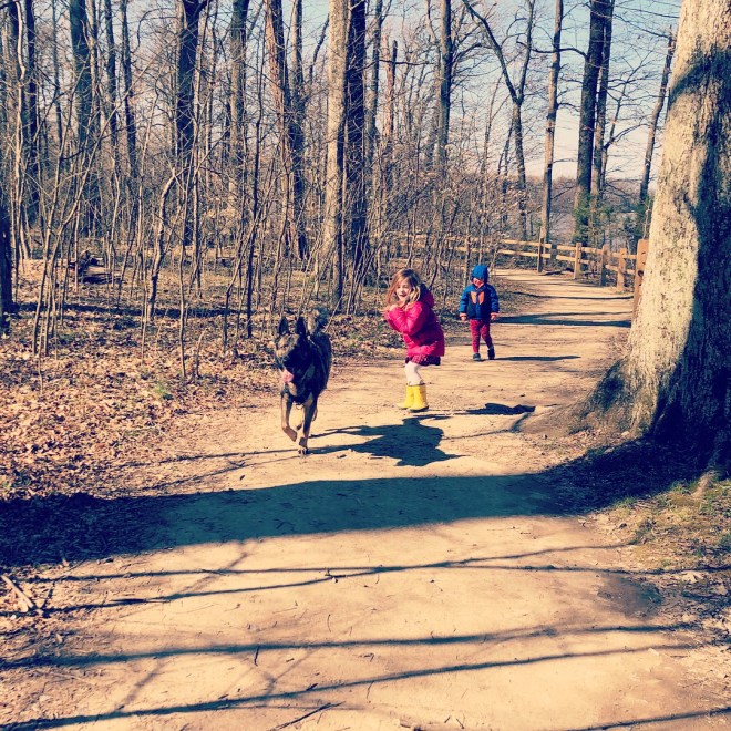 Hike 7: Mason Neck State Park (Lorton, VA), April 8, 2018. Aunt Rebecca and Brandy the dog joined us for this one. Much running and barking ensued. Yes, Nugget is wearing pajamas, no shame.