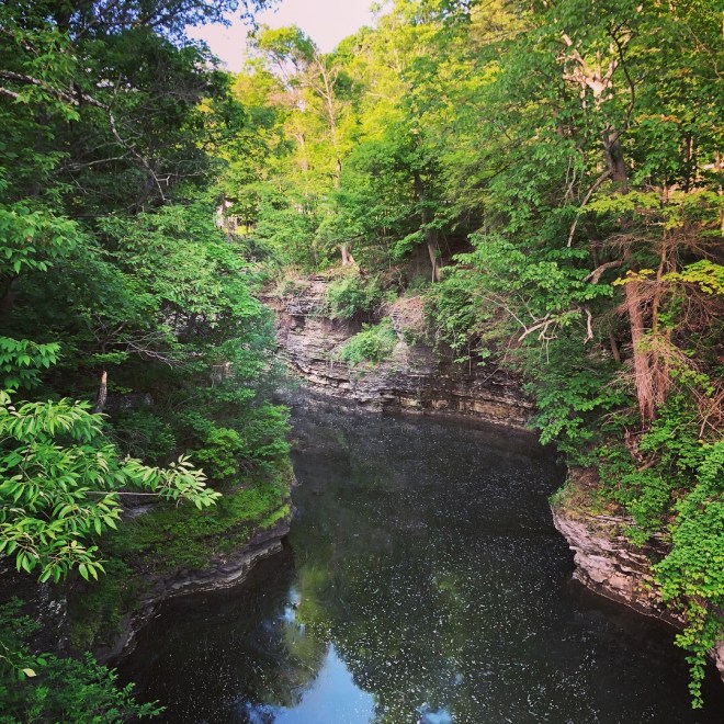 Hike 19: Beebe Lake Loop (Ithaca, New York), June 9, 2018. We found ourselves with some time to kill before the Class of 2003 dinner on Saturday night, so we decided to squeeze in one more hike, around my favorite running trail from freshman year. There are beautiful gorge views and a bridge that I used to jump off with friends from my dorm (prohibited now – apparently there are dangerous underwater rock ledges? who knew?) and a pedestrian bridge across the lake.