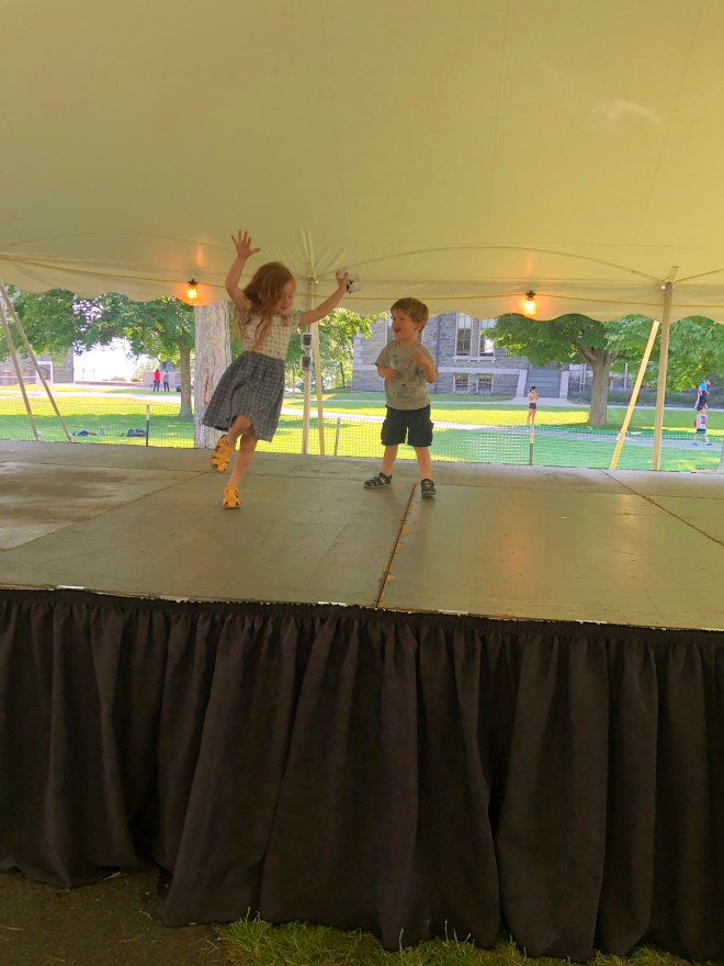 After pretty much shutting down the ILR reception (party animals!), we wandered up to North Campus in a herd for a Class of 2003 dinner – tacooooooooooos. I loaded mine up, sipped an Ithaca Brewery apricot wheat beer, chatted with more friends and watched my kids run around with the daughters of one of my sorority sisters. (Does that make them my nieces?) We hung out on the soccer field where my freshman intermural team (the Tower Pterodactyls! Eeeeeeeeeaw!) suffered a humiliating defeat at the hands of the Vet School (but I don’t want to talk about it, you guys) until the sun went down and we had two sleepy future Cornellians on our hands.