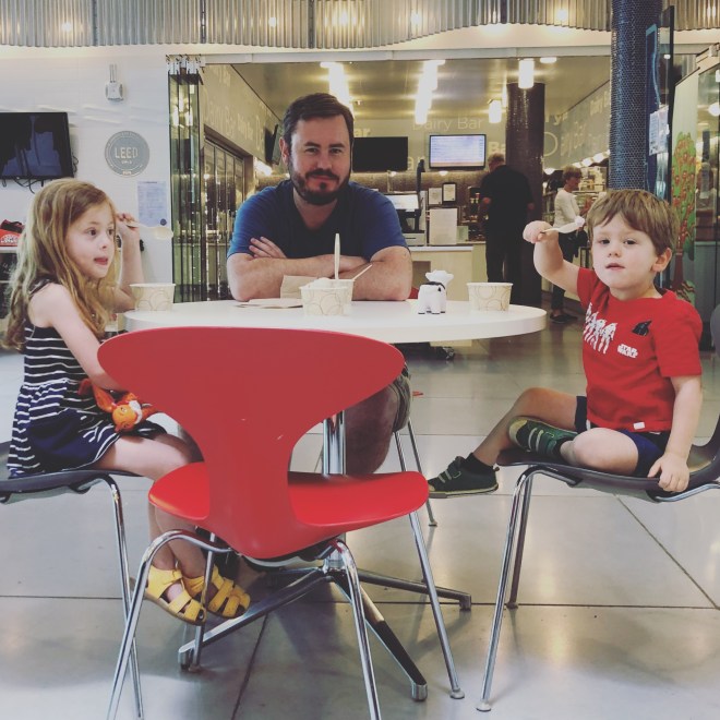 The kids went with classic strawberry, Steve had “Big Red Bear Tracks” (vanilla with chocolate swirl and caramel pieces, I think) and I had “Ezra’s Morning Cup” (coffee! my favorite). I can’t say that Cornell Dairy was one of Steve’s and my special places on campus, but I came now and then with my sorority sisters and ate way too much of this stuff in the dining halls. Plus, we’re trying to convince the kids to follow in Mommy and Daddy’s footsteps (and go to Cornell – but not be lawyers, let’s not go crazy here), and ice cream is obviously the way to do that.