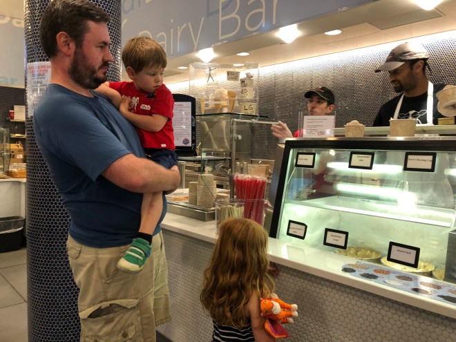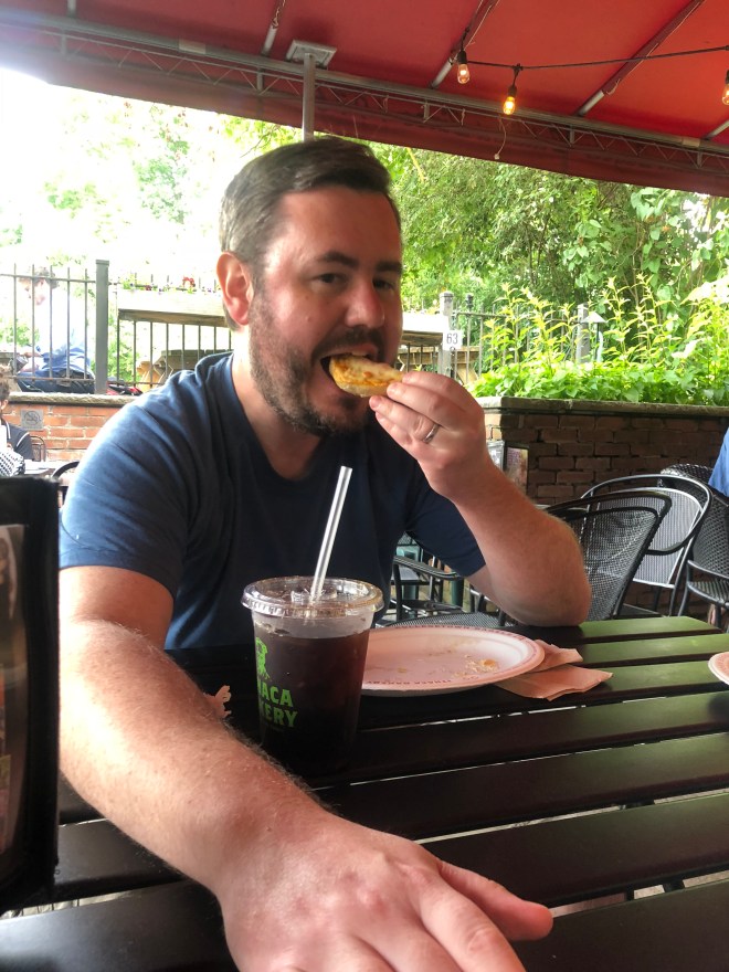 Anyway! We were up bright and early on Friday morning for more bagels, followed in short order by 9:00 a.m. ice cream to try to nip a Nugget tantrum in the bud. It sort of worked. Then we rushed back to the Airbnb so I could churn out a document and take a work call before we headed to Treman State Park – another of our favorite haunts from the early days of our relationship – for a hike, which I’ll recap separately.