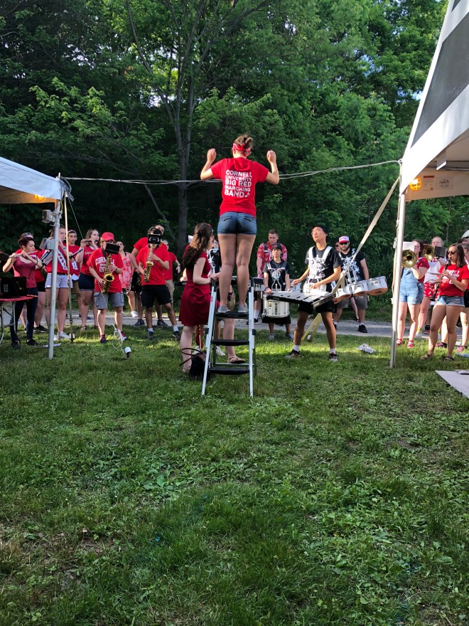 Anyway! Trail pounded and memories reminisced, we found our way to the final Class of 2003 dinner. The Big Red Marching Band was there serenading all the small children with a lively rendition of everyone’s favorite hockey cheer: “We’re gonna beat the hell out of you! F*ck ’em up, f*ck ’em up, go CU!” I fully support the sentiment, but it did seem like a weird choice for the fifteen-year crowd, most of whom had their little kids in tow. What’s wrong with the alma mater?