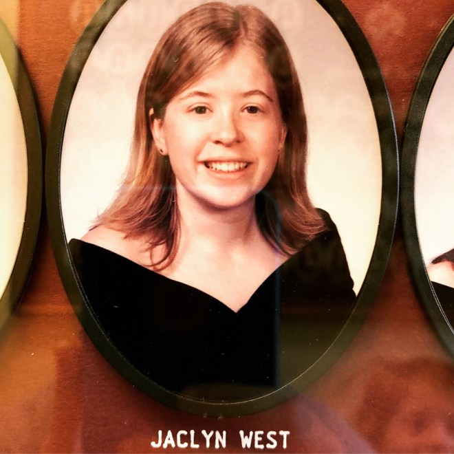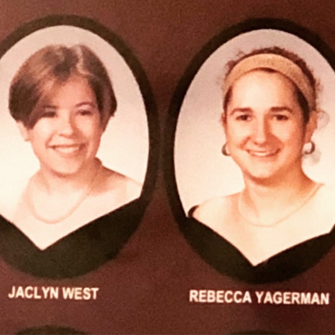And senior Jac, much more confident in her own skin. But clearly, I didn’t have it all figured out at the ripe old age of 21. You can’t tell from the picture, but I’m wearing electric blue eyeshadow. Yowsa. I said to the house mom, “What was I thinking?” and she responded, “You were thinking that it was 2003.” At least I had something going for me: my bestie by my side. Rebecca and I have been inseparable since sophomore year. (She actually started trying to be friends when we were freshmen, but I was convinced she was way too cool to want to be friends with little old me and so she must have an ulterior motive – so I blew her off. Fortunately for me, she kept trying. And by junior year, I had the earth-shattering realization that I am actually cooler. Let me tell you, that was surprising.) Also: yes, I chopped off all of my hair junior year. This was me starting to grow it back out after it occurred to me that I didn’t actually want to look like Annette Bening.