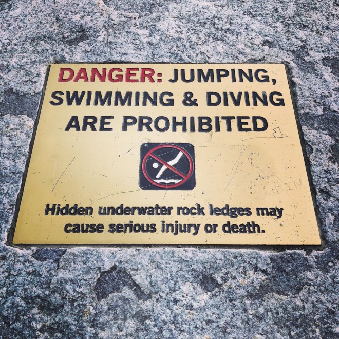 Whoops. That plaque was not there when I was a freshman with a hobby of flinging myself into the lake from 35 feet up. For the record, the worst thing that ever happened to me was a case of swimmer’s ear, and I’ve lost count of how many times I jumped that thing. But still – don’t try this at home, kids.