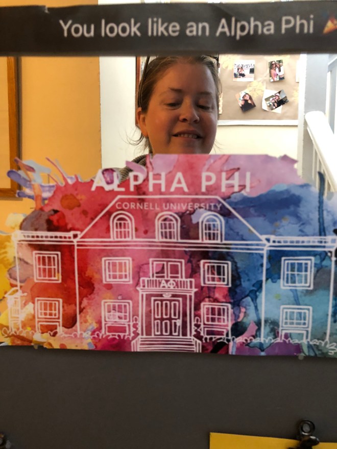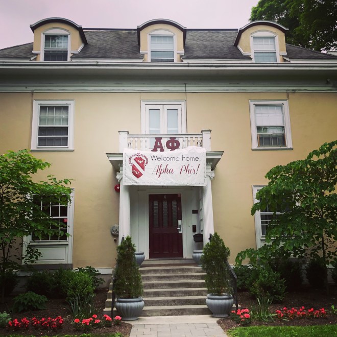 Now that I’m a mom, I’m a little more anxious about the idea of my kids joining the Greek system, but I have to say – I had nothing but positive experiences. I mentioned that to the current Alpha Phi house mom, who was a sister when I was a pledge, and she was glad to hear that. I was never hazed, because our international headquarters had a strict “no hazing” policy and our local chapter had a strict policy of following the international policy. As the current house mom put it, they didn’t see any point to hazing – didn’t think it was a bonding experience and felt there was a better way to build sisterly bonds. So instead of scrubbing floors with a toothbrush (or worse) I was taken on ski trips, showered with gifts from my generous big sis, serenaded in my dorm room by the most popular a capella group on campus (also courtesy of my big sis), and generally loved and protected by dozens of older girls as I was finding my way on campus. No “sketchy boy” got within ten feet of any of the pledges, but we did have a fun trip downtown to go to the movies and dominate a Vermonster together. And did it work? Well… my best friend (and godmother to my children) is an Alpha Phi, and we all still love and support each other today. So I think it did.