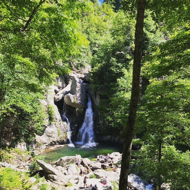 The falls were gorgeous!  And it was a hot day – the water looked so inviting.  There were people wading and swimming (despite signs warning visitors not to swim) but having kids on our backs, we stayed well up on the driest part of the boulders.