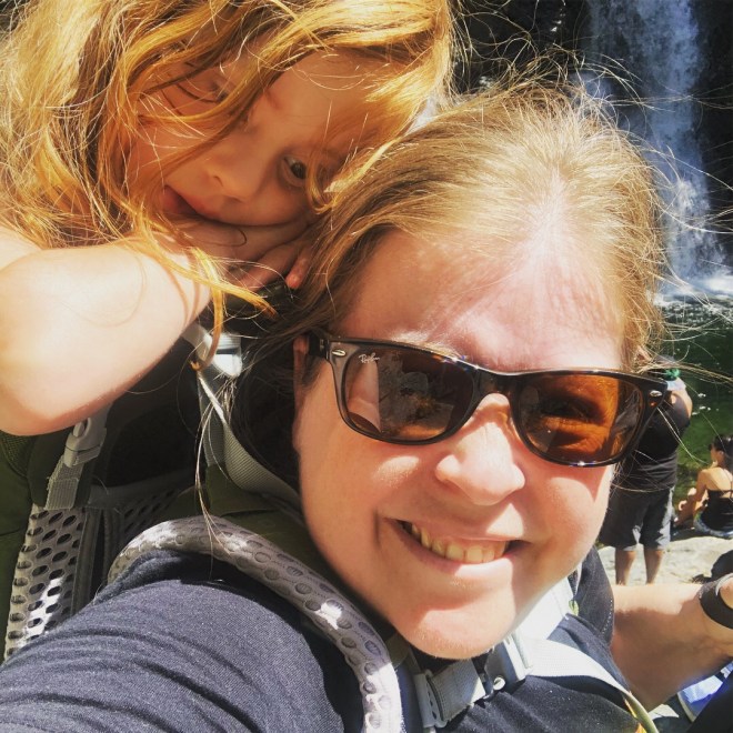 Anyway, after listening to Peanut whine for 15 minutes (keeping it real, folks) I told her I was done carrying her and, also, time to go.  I plucked her out of the backpack and told her she was hiking out of the ravine on her own two feet.  Which she did, powered by her five-year-old rage, without breaking a sweat.  When we got back to the parking lot, the four adults were heaving out-of-breath and dripping with sweat, and she looked like she’d been sitting on the couch watching cartoons.  So unfair.