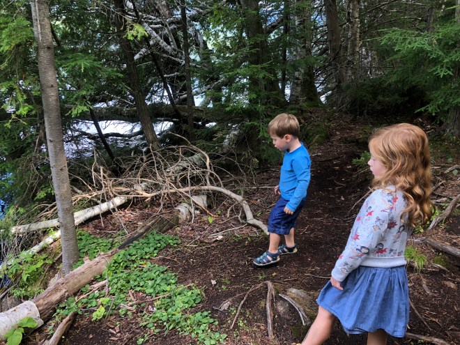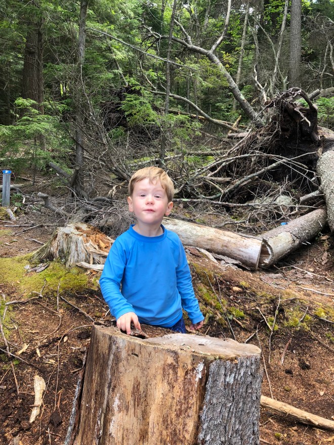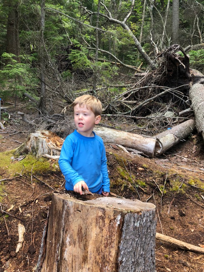 Nugget and Peanut dove right into their favorite hiking activities. Peanut immersed herself in tracking “the Blood,” a forest creature of her own invention (shhhh) and Nugget set up a camp kitchen. We probably loitered by this stump for twenty minutes while he cooked up trail delicacies for the rest of the family – and the Blood.