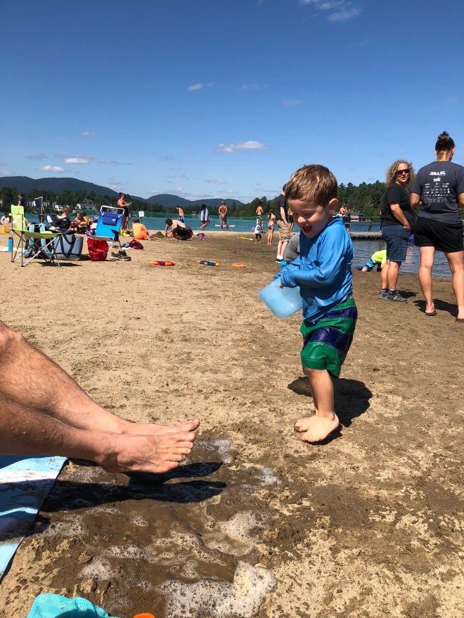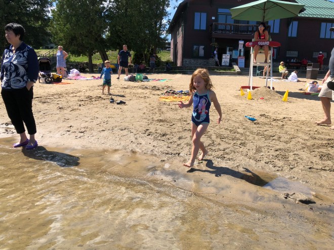 That afternoon, Nana and Grandad arrived to share in our Adirondack fun, and we all headed over to the municipal beach on Mirror Lake. My memories of this beach are all wintery. I’ve tobogganed down the hill and onto the frozen lake, and practiced my skating moves here on freezing February days – but I don’t think I’ve ever waded in on a warm August day. Time to correct that!