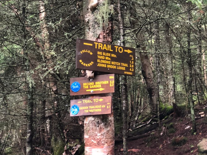 Eventually, even these breathtaking views started to get old, and I began to whine again. I was a real peach! If you’re wondering how Steve puts up with me, don’t expect me to explain it to you. It felt like an eternity before we hit the junction with the Johns Brook Valley trail and saw this sign: